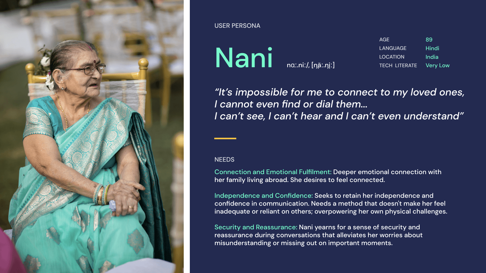 Parivaar (“Family”) reimagines how elderly individuals with low technical literacy can stay emotionally connected with loved ones abroad. The project focuses on empathy-driven communication that empowers seniors to connect confidently and independently.